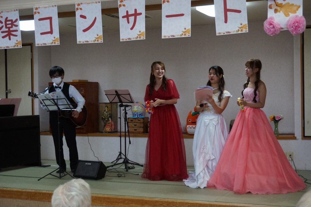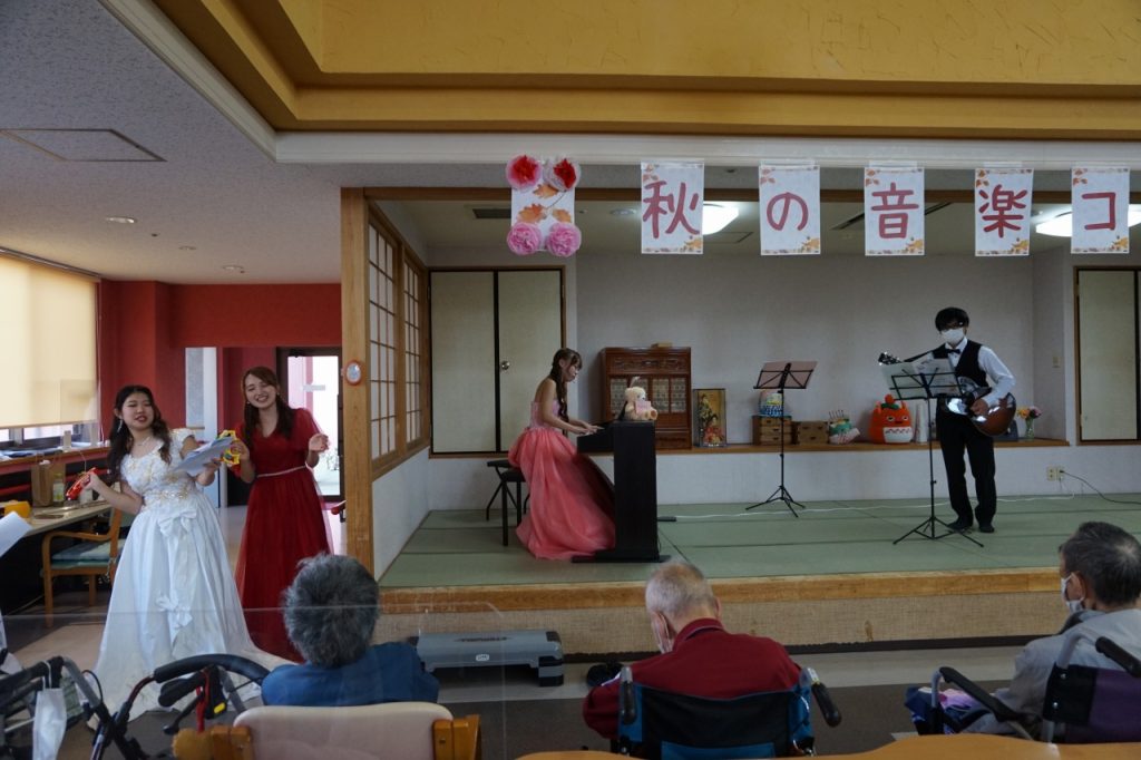 宇都宮短期大学音楽科学生さん3名によるコンサートを開催いたしました。特養とデイの利用者参加され、生の音楽を近くで聴け、一緒に歌ったり楽しいひと時を過ごすことができました。職員も飛び入り参加させていただき、次回も楽しみに待ってます。