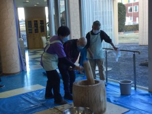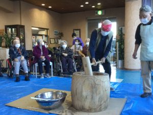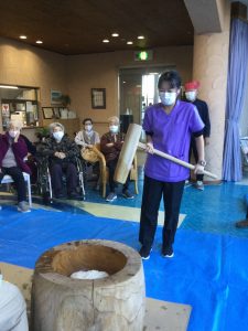 介護職員・相談員・事務員総出で、大盛り上がりのおもちつきでした。